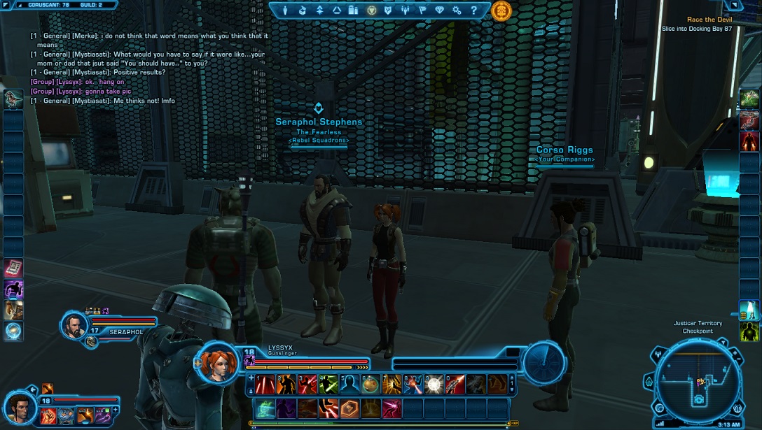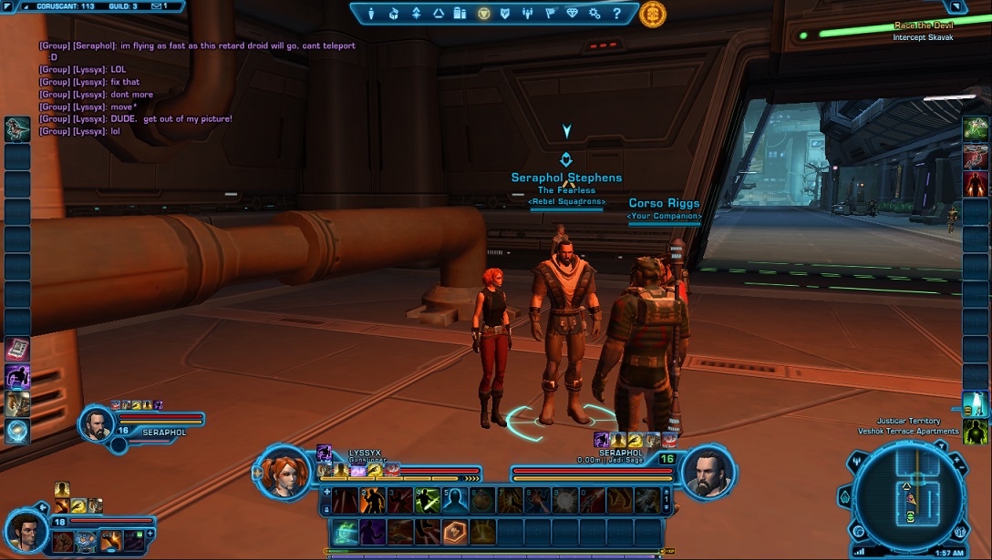 Ray and Seraphol did class quests on Coruscant in the justican (seraphol: Shadows) and the works (Ray: race the devil) sections. we also got the yellow matrix shard from the works... and seraphol got the datacron in justicar. Ray got sick of falling and gave up on that one after about the 90th try. -_-