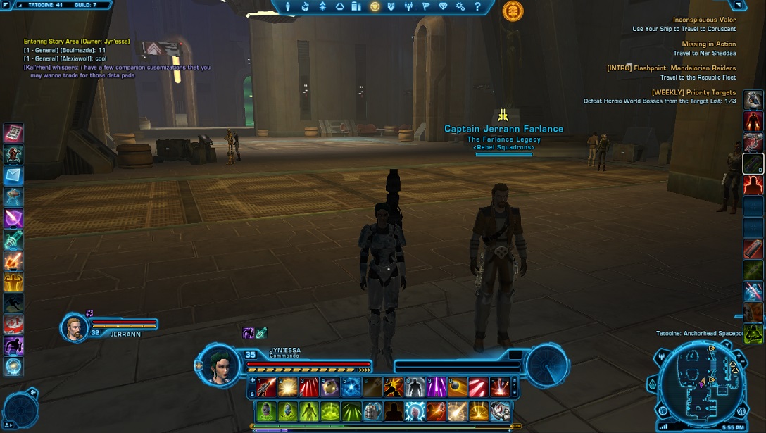 Ray and Jaran: did jarans class quest on Tattoine (Bait), finished his class quest on Nar Shaddaa (The Endless Abyss), Finished Chapter One (you cant spend infamy). Ray's class quest was The Justice, where we defeated Tavus (what a jerk), and back on the fleet, completed Time Off. Also hit the trainers and the crew skill trainers.